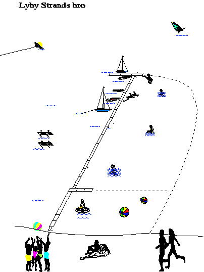 broens længde er et, med bøjer afspærret, område til badegæster. Der er tre trapper, hvor der er ca. 2m vand ved den